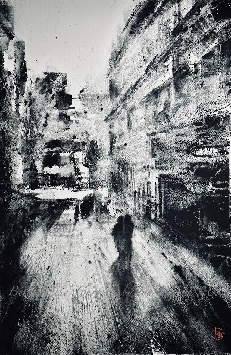 Figures dissolve into shadows, carried by the rushing current of the street, while one presence lingers, slightly slower, slightly heavier, resisting the pull of speed. Buildings lean inward, as if breathing with the crowd, their edges blurred by movement and time.