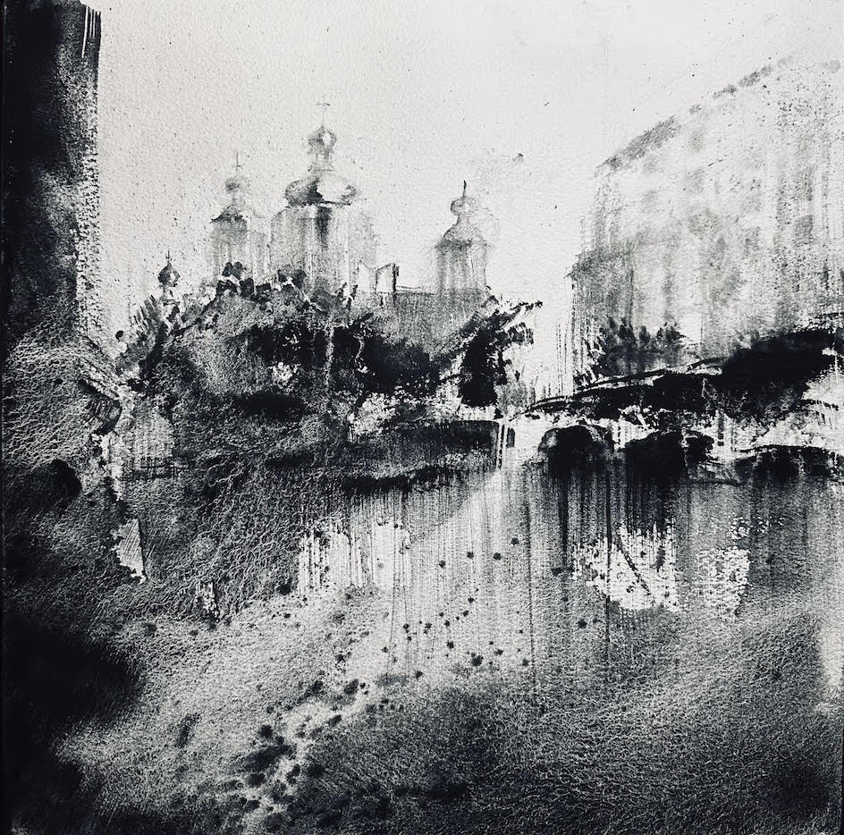Granulated shadows drift across the pavement like echoes of footsteps long faded, while delicate washes of light pull the gaze upward toward the faint gleam of the crosses. The scene breathes with reverence – subtle, lingering, almost whispered.