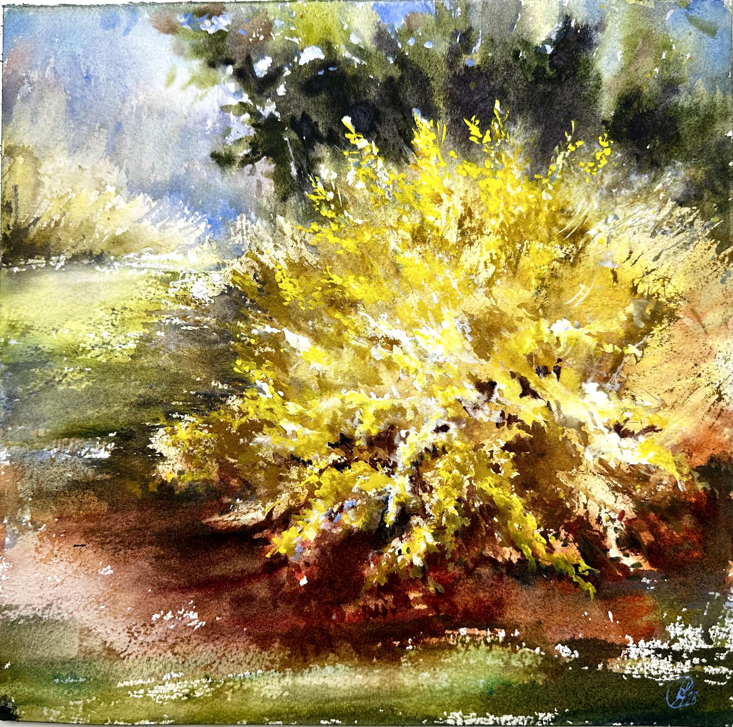 This painting is mounted on a wooden board 12 x 12 x 1 (31 x 31 x 2 cm), sealed and waxed for protection.
