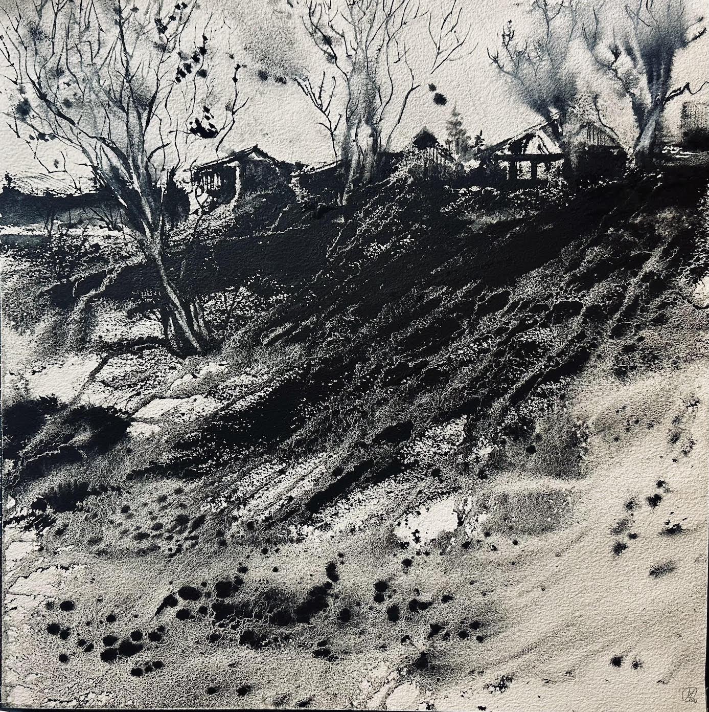 A hillside dissolves into granules and memory – a place neither here nor gone, caught in a breath between winter trees and fading rooftops. The land drifts like a half-spoken story, the houses perched on the edge of silence, the sky whispering in washes of grey.